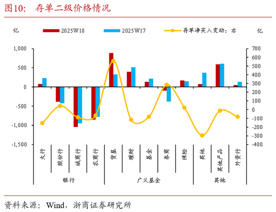 (2)按照边际情况来看,其中,货基/保险增持规模扩大,产品户/其他非银机构/大行/理财/基金/外资行增持规模下降,券商/股份行减持规模下降,农商行/城商行减持规模扩大;