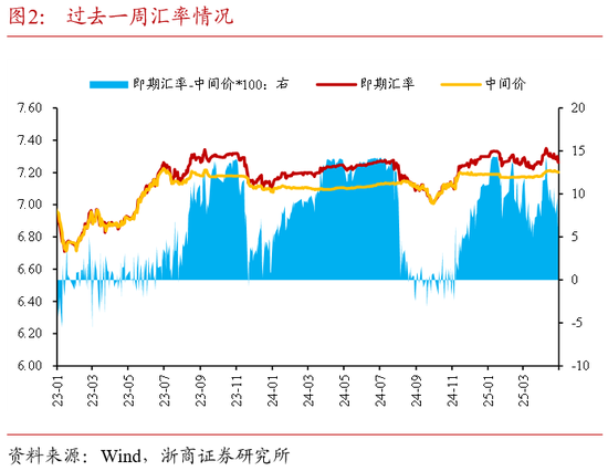 2、汇率走势跟踪:统计期内人民币兑美元即期汇率小幅升值2个基点,逆周期因子运用仍较为明显。