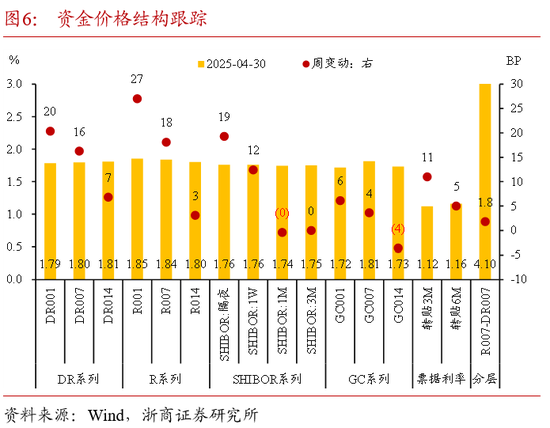 (3)资金价格部分,关键期限资金利率上行,DR007上行至1.8%,流动性分层在低位徘徊,R系列走势与DR系列同步,非银流动性相对充裕;