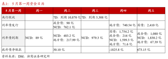 (1)4月MLF净投放5000亿,但买断式逆回购首次缩量续作,净回笼5000亿。综合来看,中长期流动性等量续作,结构有所调整。5月资金面在政府债加速发行、买断式逆回购到期量较大等资金缺口影响下,核心关注点还在央行的操作,央行预计配合财政发力维稳资金面。由于MLF和买断回购前后操作方向相反,市场对降准降息的预期出现反复和分化,我们认为,宽货币方向不变的前提下,节奏还是根据国内外形势变化而确定;